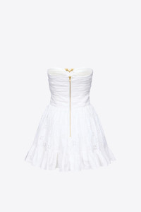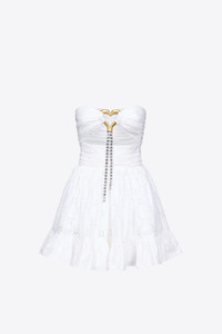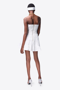 Strapless mini dress of cotton broderie anglaise draped around a brass heart jewel with crystal fringe. Features ruffled hem and exposed zipper at center back. Available in Off White. - 100% Cotton - Dry Clean Only - Model is 5'10" and wears a size US 2