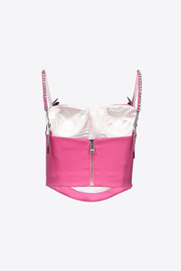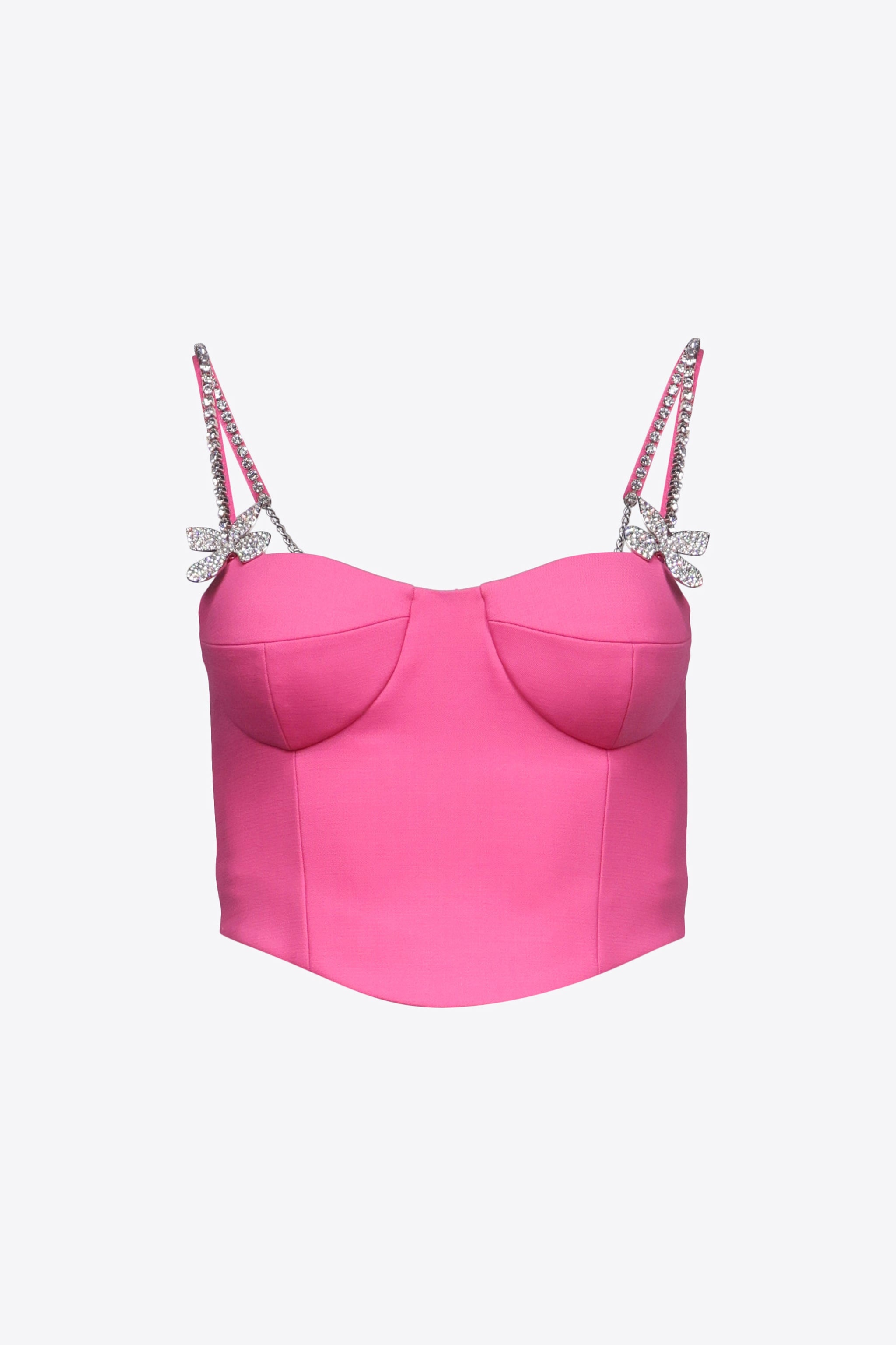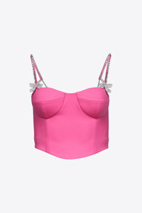 Wool suiting bustier with pave crystal butterfly and crystal cupchain embellishment on straps. Features adjustable straps. Available in Carmine Rose & Black. - 99% Virgin Wool, 1% Lycra - Dry Clean Only - Model is 5'11.5" and wears a size US 2