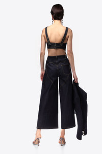 Raw denim cutout butterfly bustier features adjustable button closure straps and exposed back zipper. Available in Dark Indigo. - 100% Cotton - Dry Clean Only - Model is 5'11.5" and wears a size US 2