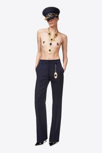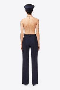 Wool suiting mid rise straight leg trouser. Features detachable gemstone chain plate. Available in Midnight Blue. - Made in Italy - 100% Virgin Wool - Dry Clean Only - Model is 5'9.5" and wears a size US 2