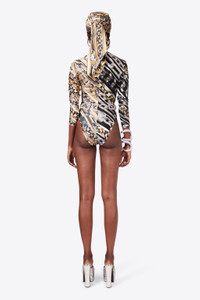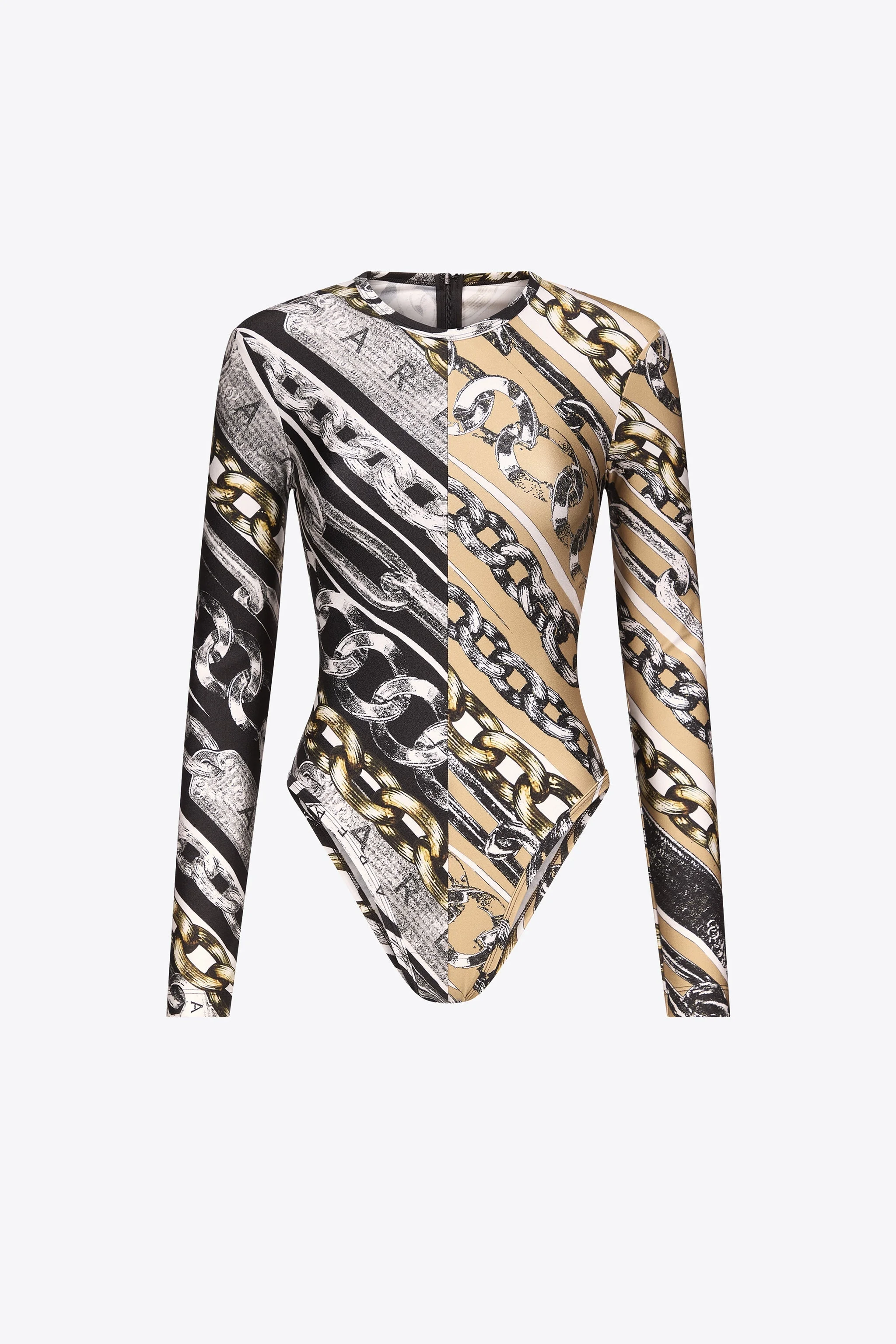 Chain printed lycra long sleeve bodysuit featuring hidden back zipper and snap button closure at crotch. Available in Multi. - Made in Italy - 80% Polyamide, 20% Elastane - Dry Clean Only - Model is 5'10" and wears a size S