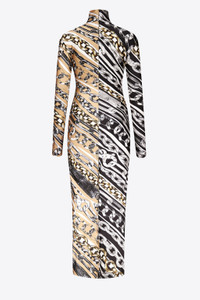 Chain printed lycra long sleeve turtleneck midi dress. Features hidden back zipper and slit at center back. Available in Multi. - Made in Italy - 80% Polyamide, 20% Elastane - Dry Clean Only - Model is 5'11" and wears a size S