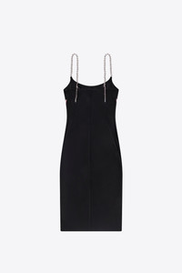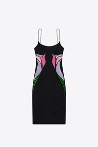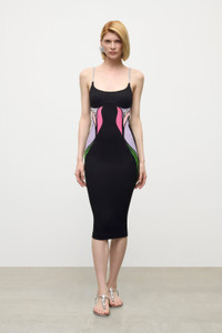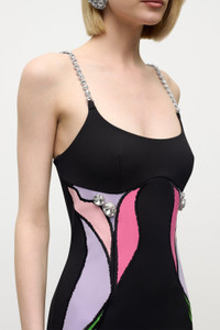 Compact ponte midi dress featuring adjustable crystal straps and lily flower intarsia. Available in Black. - 65% Rayon, 30% Nylon, 5% Elastane - Dry Clean Only - Model is 5'9.5" and wears a size S