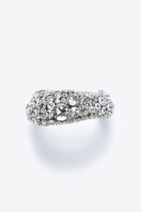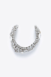 Crystal cluster bone necklace on silver base. Available in Crystal. - 136 mm x 57 mm with 75 mm opening - 55% Zinc, 30% Glass, 10% Brass, 5% Cubic Zirconia