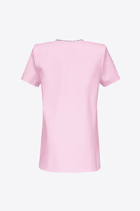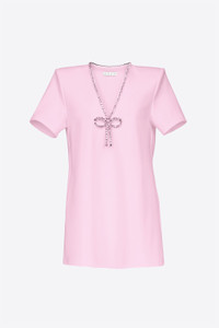 Ponte jersey v-neck t-shirt dress. Features crystal bow detail at front center and crystal trim. Available in Pale Pink, Black and White. - 67% Rayon, 28% Nylon, 5% Elastane - Dry Clean Only - Runs true to size. Model is 5'10" and wears a size S