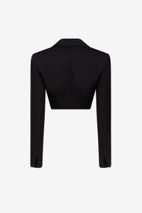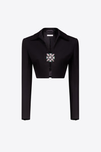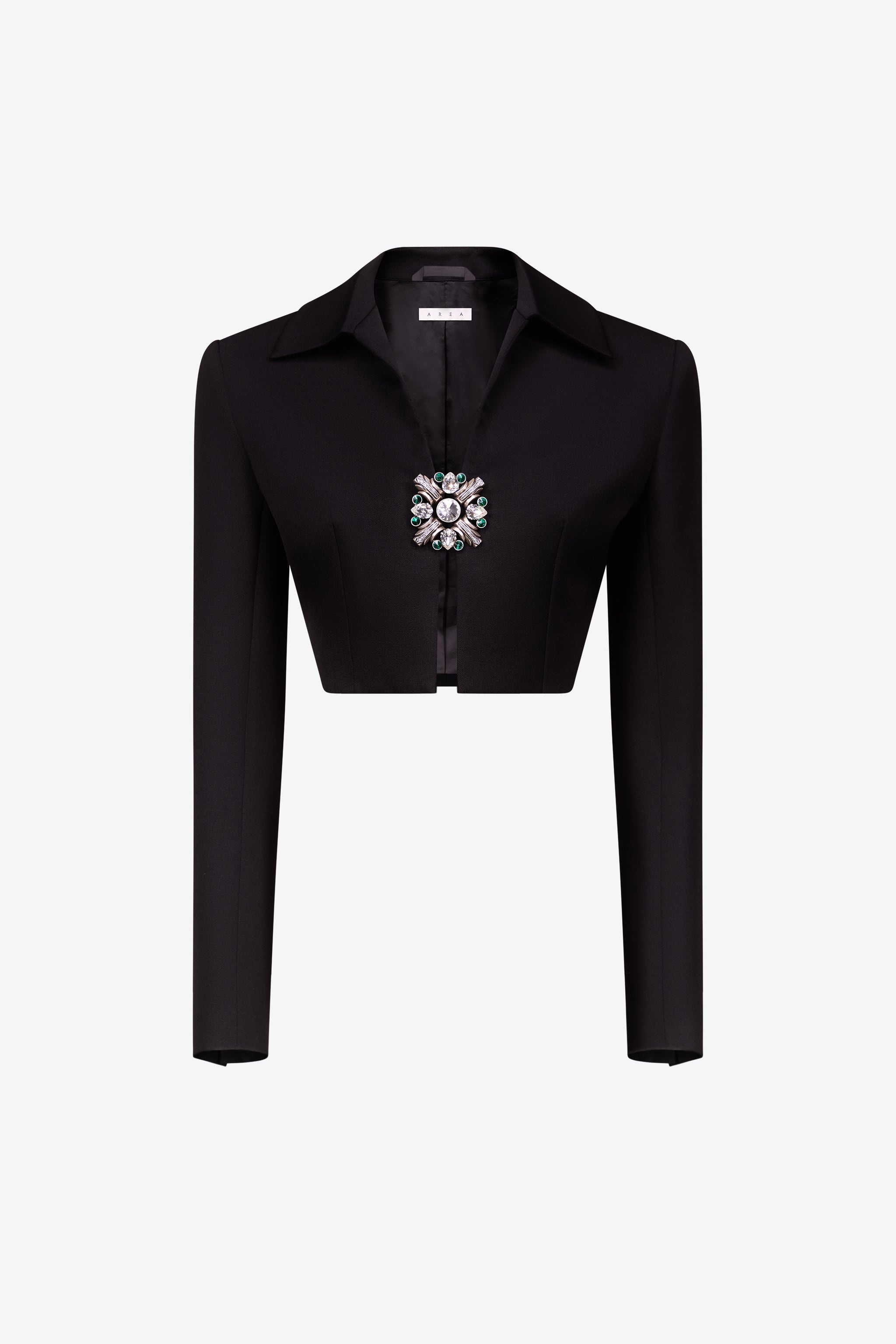 Wool suiting cropped blazer featuring crystal brooch embellishment front button closure. Available in Black & Whipped White. - Made in Italy - 100% Virgin Wool - Dry Clean Only - Model is 5'10" and wears a size US 2