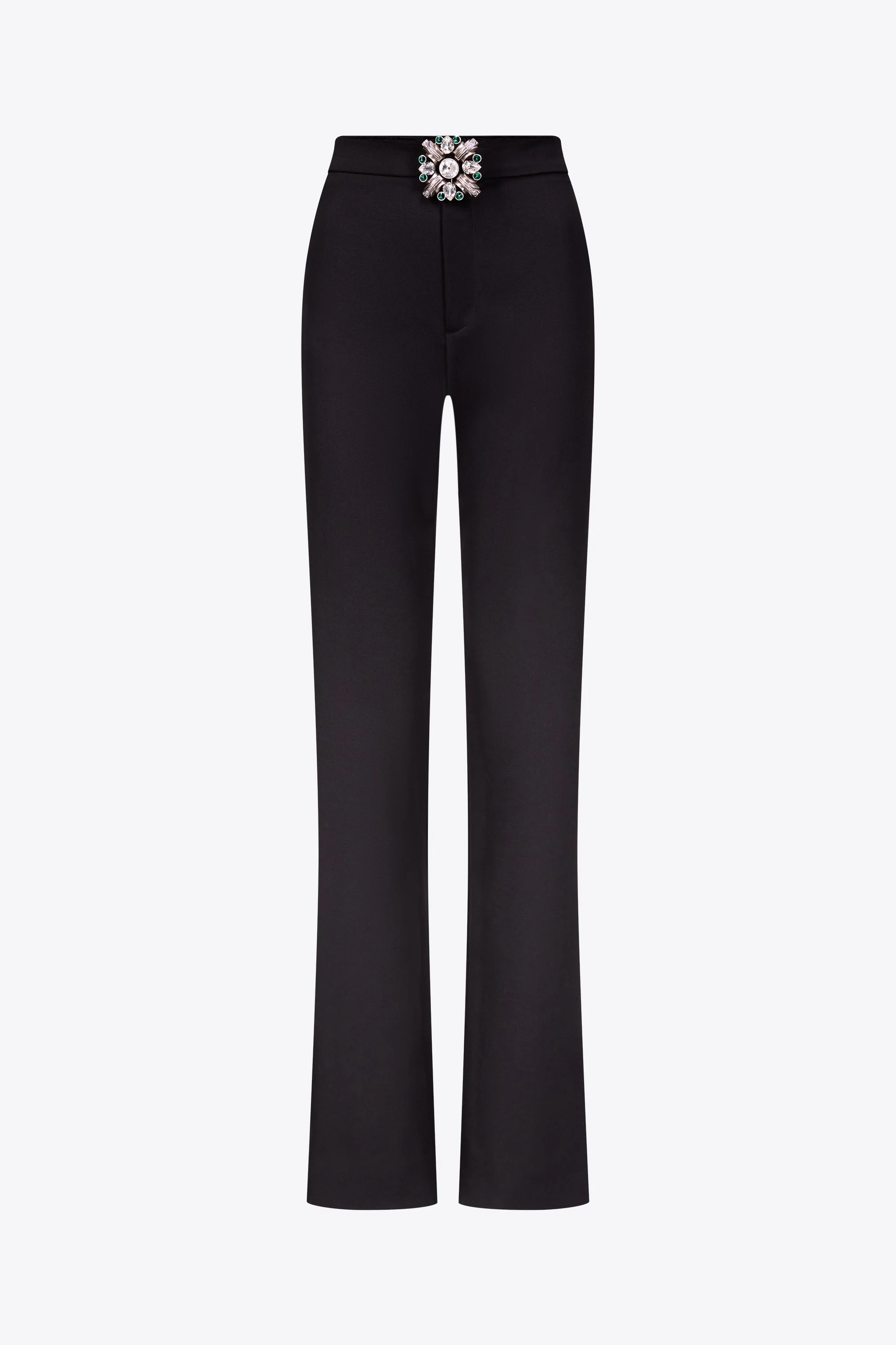 Wool suiting straight leg trousers featuring crystal brooch embellishment front button closure. Available in Black & Whipped White. - Made in Italy - 100% Virgin Wool - Dry Clean Only - Model is 5'11" and wears a size US 2