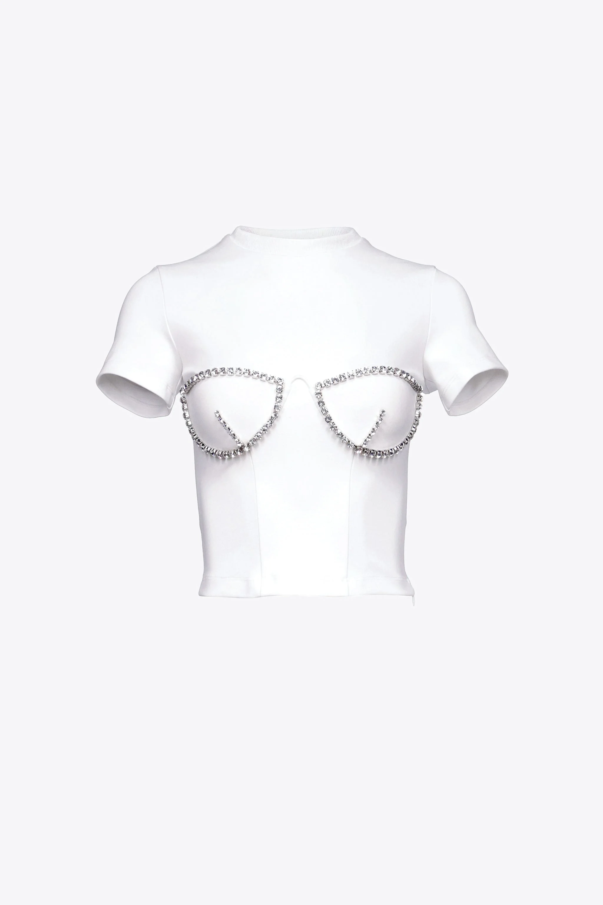 Compact ponte jersey bustier cup t-shirt. Features crystal trim cup with underwire and hidden side zip. Available in White, Pale Pink & Black. - 67% Rayon, 28% Nylon, 5% Elastane - Dry Clean Only - Model is 5'11.5" and wears a size S