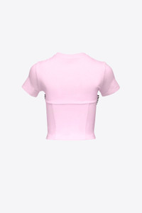 Compact ponte jersey bustier cup t-shirt. Features crystal trim cup with underwire and hidden side zip. Available in Pale Pink, Black & White. - 67% Rayon, 28% Nylon, 5% Elastane - Dry Clean Only - Model is 5'10" and wears a size S