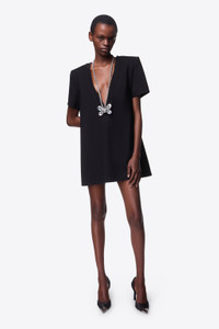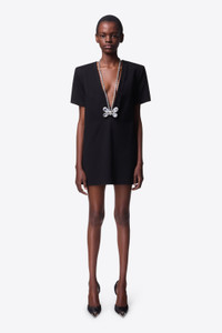 Compact ponte jersey v-neck t-shirt dress featuring detachable crystal butterfly cupchain brooch, slit pockets and structured shoulder. Available in Black, Grey Melange & Off White. - 67% Rayon, 28% Nylon, 5% Elastane - Dry Clean Only - Model is 5'10" and wears a size S