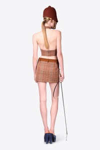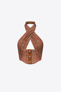 Checked pattern wool halter top with crystal buttons. Features back zipper and hook and eye neck closure. Available in Camel Multi. - 65% Wool, 35% Polyester - Dry Clean Only - Model is 5'11" and wears a size US 2