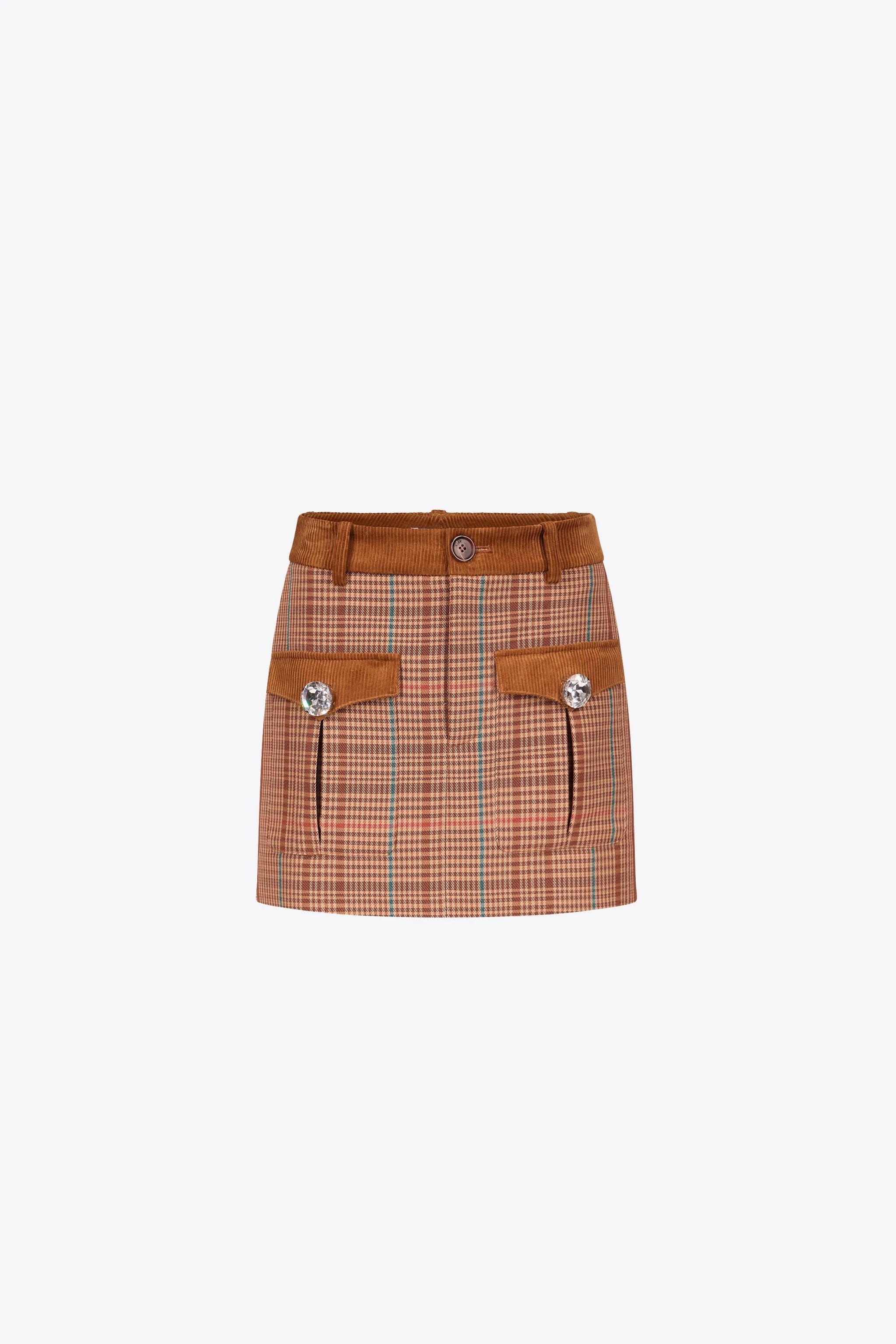 Checked pattern wool mini skirt with jumbo crystal buttons. Features zip front fly camel corduroy trim. Available in Camel Multi. - 65% Wool, 35% Polyester - Dry Clean Only - Model is 5'11" and wears a size US 2
