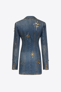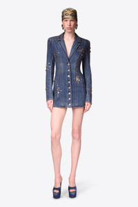 Denim blazer dress with front button closure and crystal button and shank embellishment throughout. Can be worn both as a dress or blazer. Available in Dark Blue. - 100% Cotton - Dry Clean Only - Model is 5'11" and wears a US 2