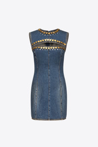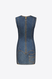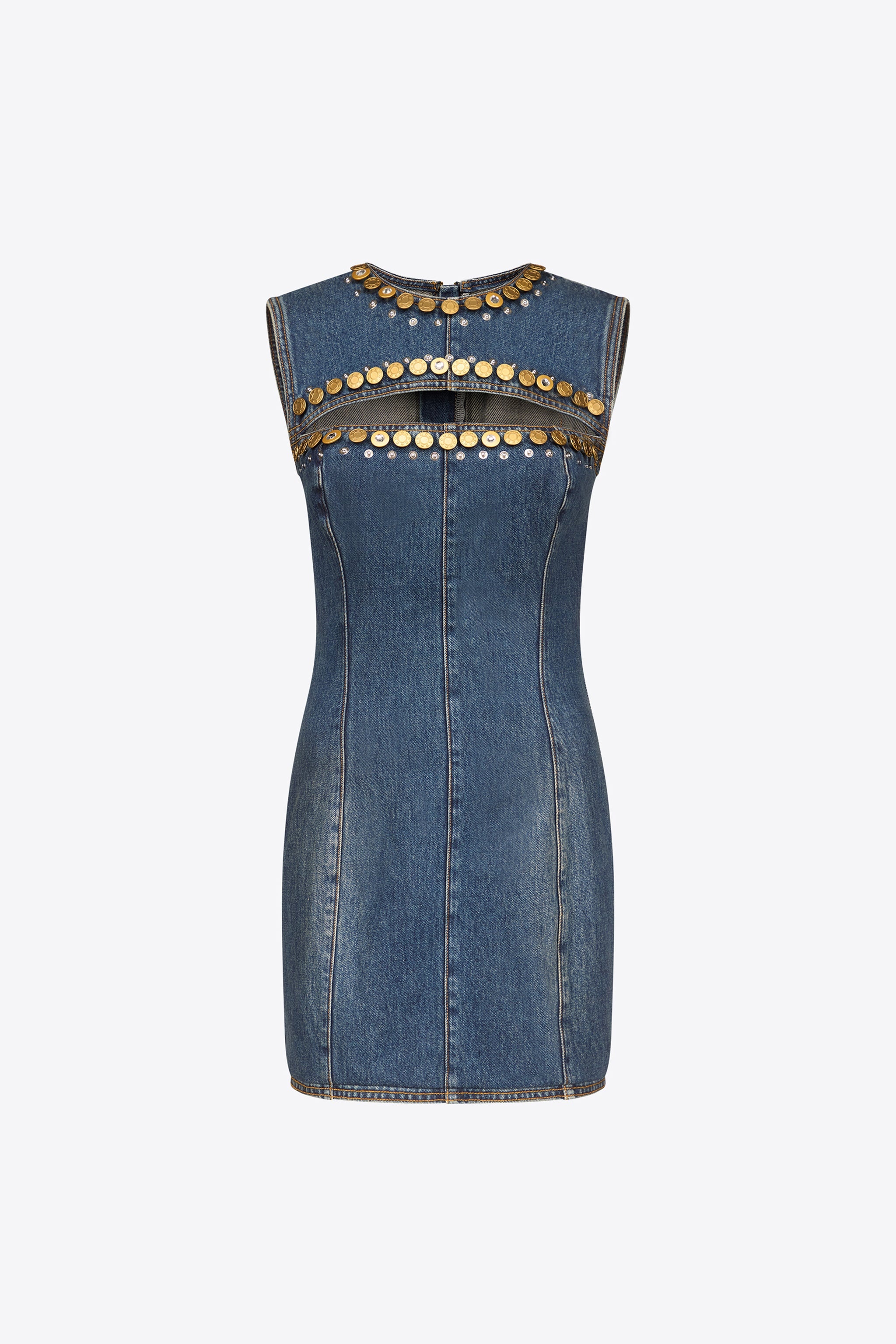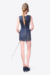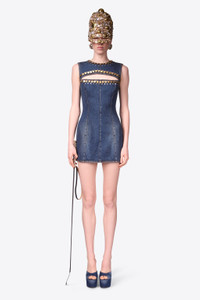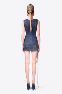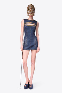 Denim sleeveless mini dress featuring slit at chest trimmed with crystal buttons and shanks. Available in Dark Blue. - 100% Cotton - Dry Clean Only - Model is 5'11" and wears a size US 2