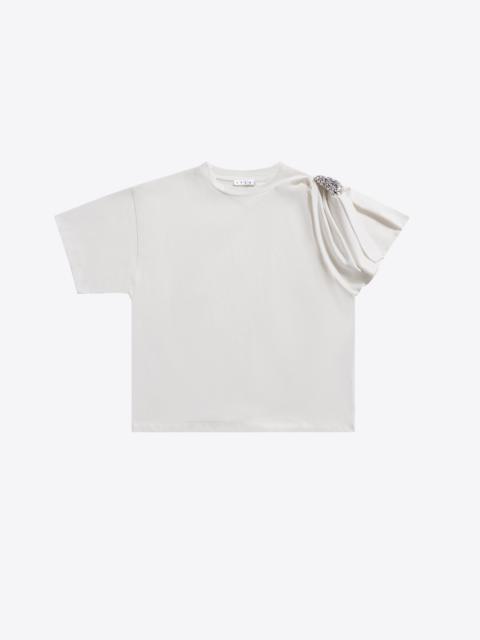 Cotton asymmetrical t-shirt featuring crystal cluster embellishment at shoulder. Available in Black & White. - Made in Italy - 100% Cotton - Dry Clean Only - Model is 5'9.5" and wears a size S.