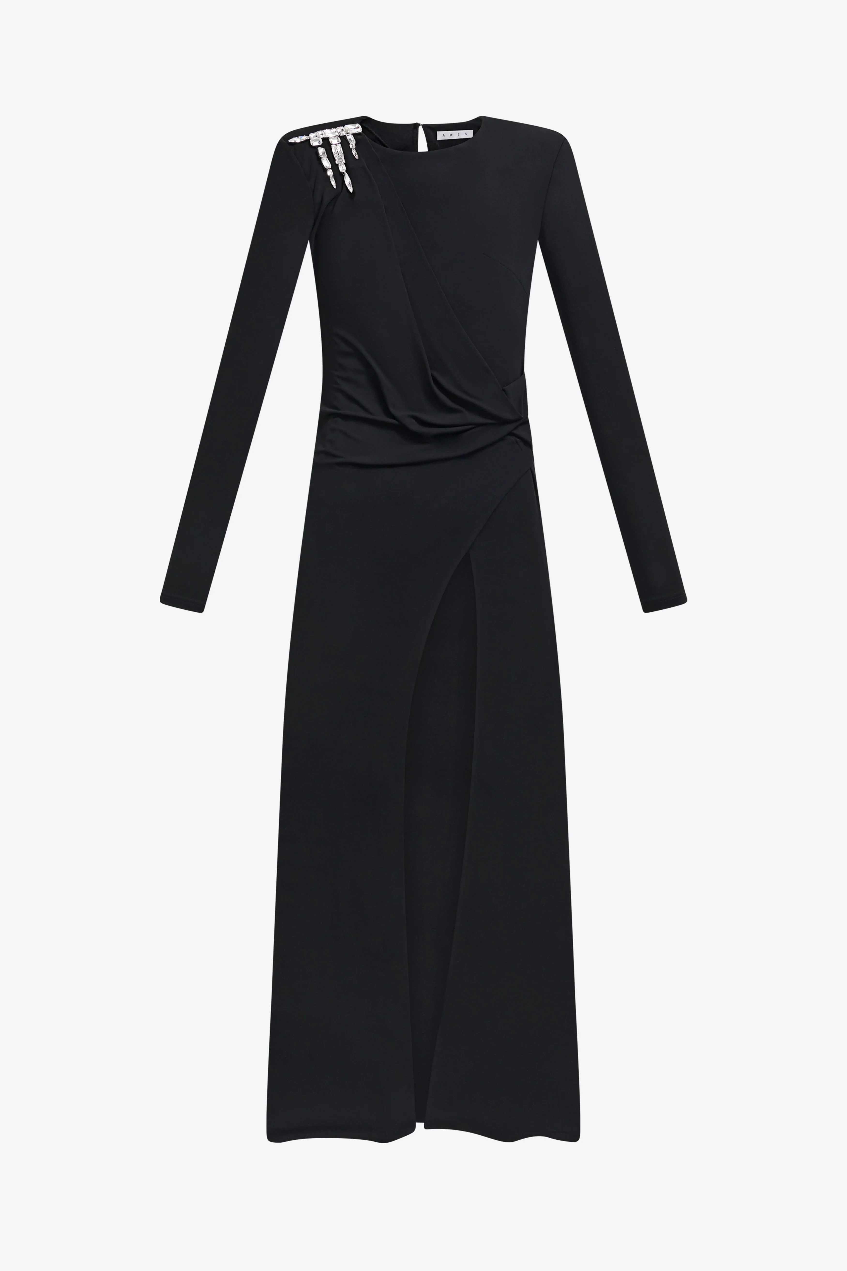 Jersey long sleeve draped gown featuring side slit and crystal cluster embellishment at shoulder. Available in Black. - 92% Viscose, 8% Elastane - Dry Clean Only - Model is 5'8" and wears a size S