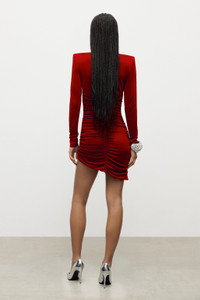 Jersey draped long sleeve mini dress featuring crystal cluster embellishment. Available in Wine Red. - 95% Polyester, 5% Elastane - Dry Clean Only - Model is 5'8" and wears a size S