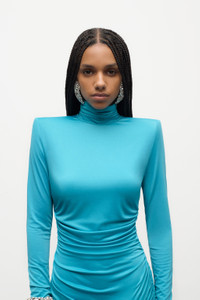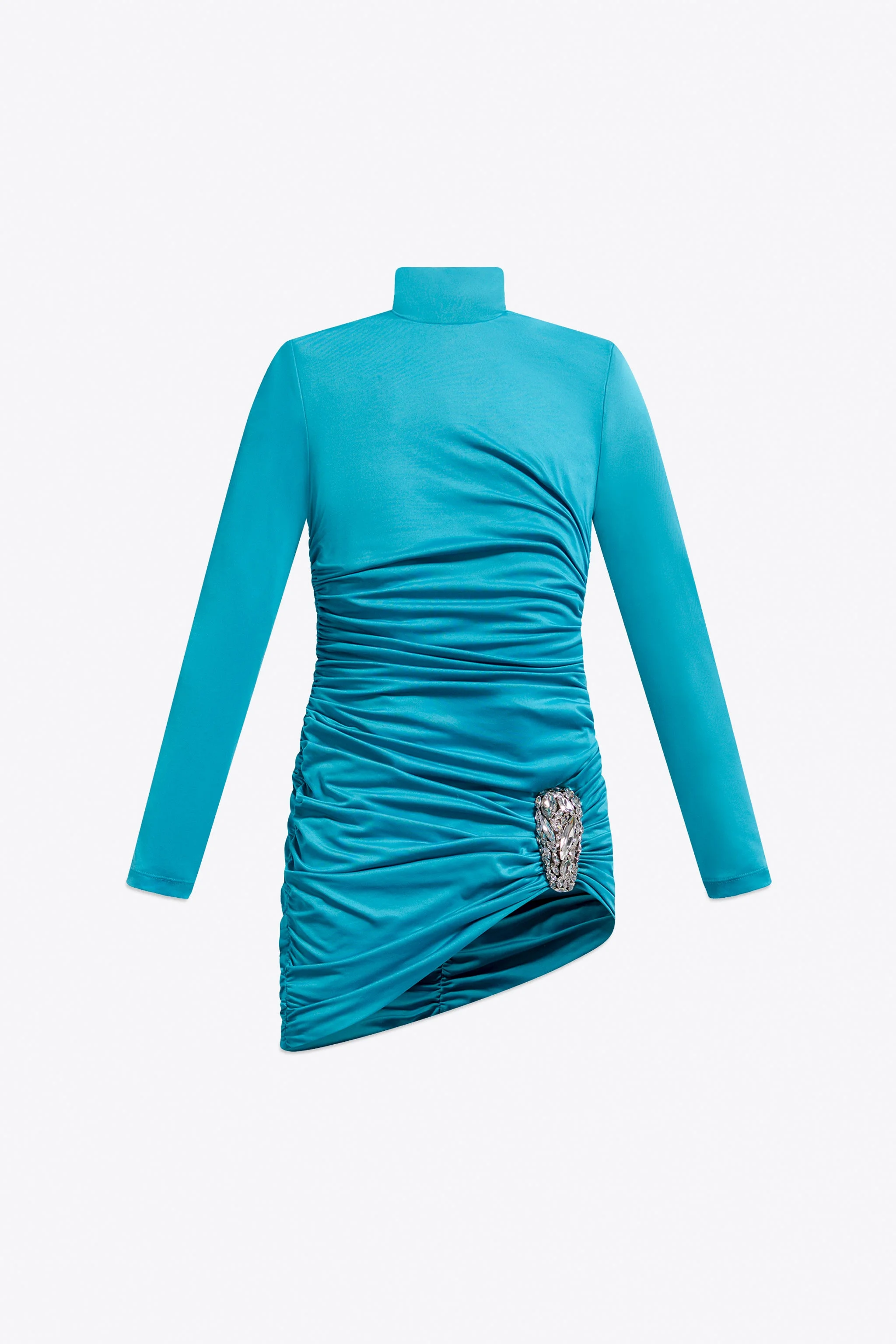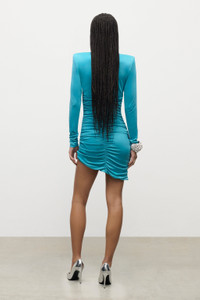 Jersey draped long sleeve mini dress featuring crystal cluster embellishment. Available in Teal & Black. - 95% Polyester, 5% Elastane - Dry Clean Only - Model is 5'9" and wears a size S