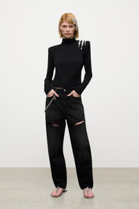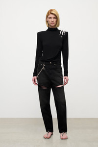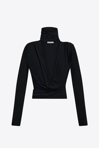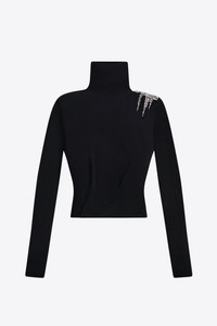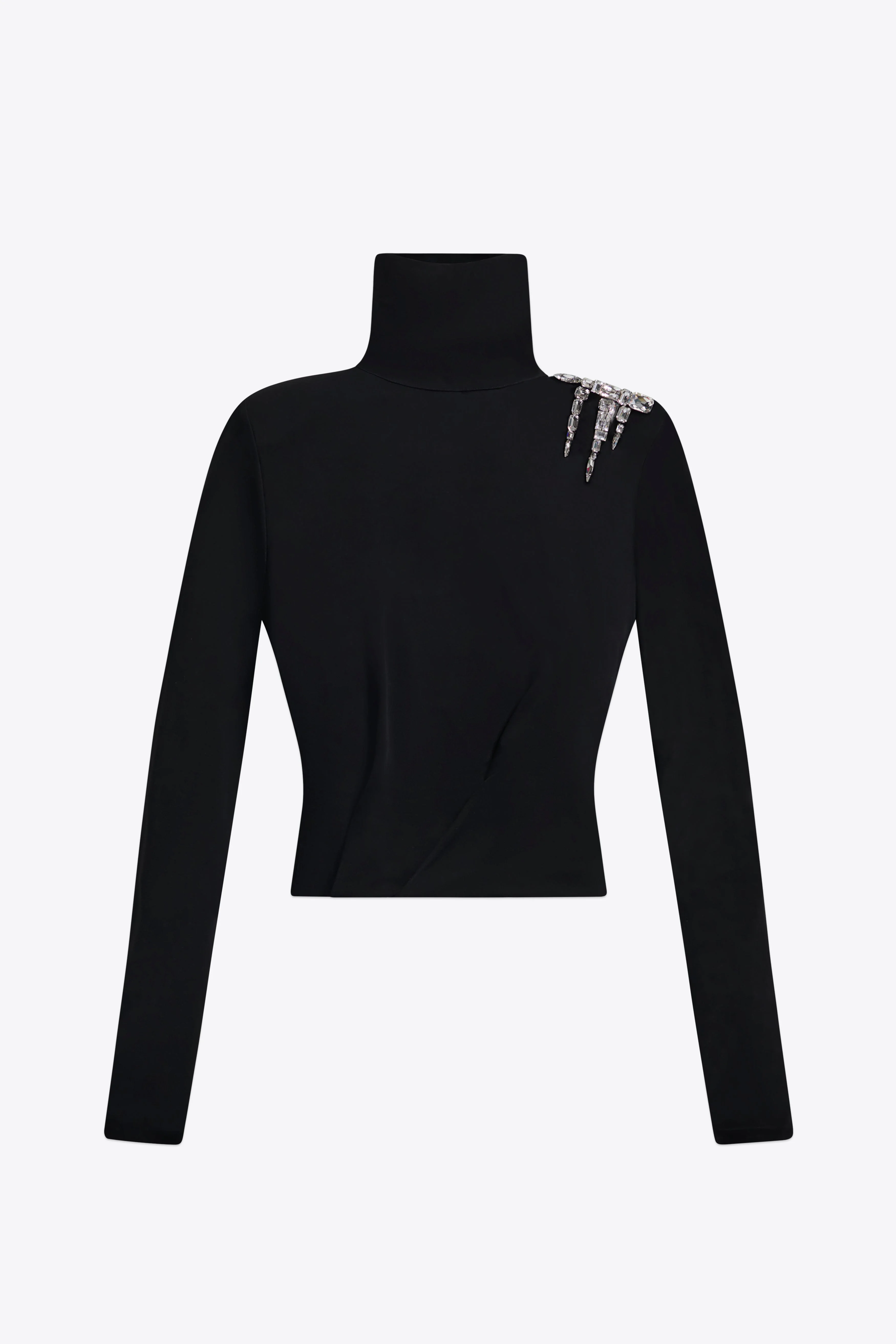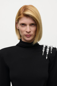 Jersey long sleeve open back top featuring crystal cluster embellishment at shoulder. Available in Black. - 92% Viscose, 8% Elastane - Dry Clean Only - Model is 5'9.5" and wears a size S
