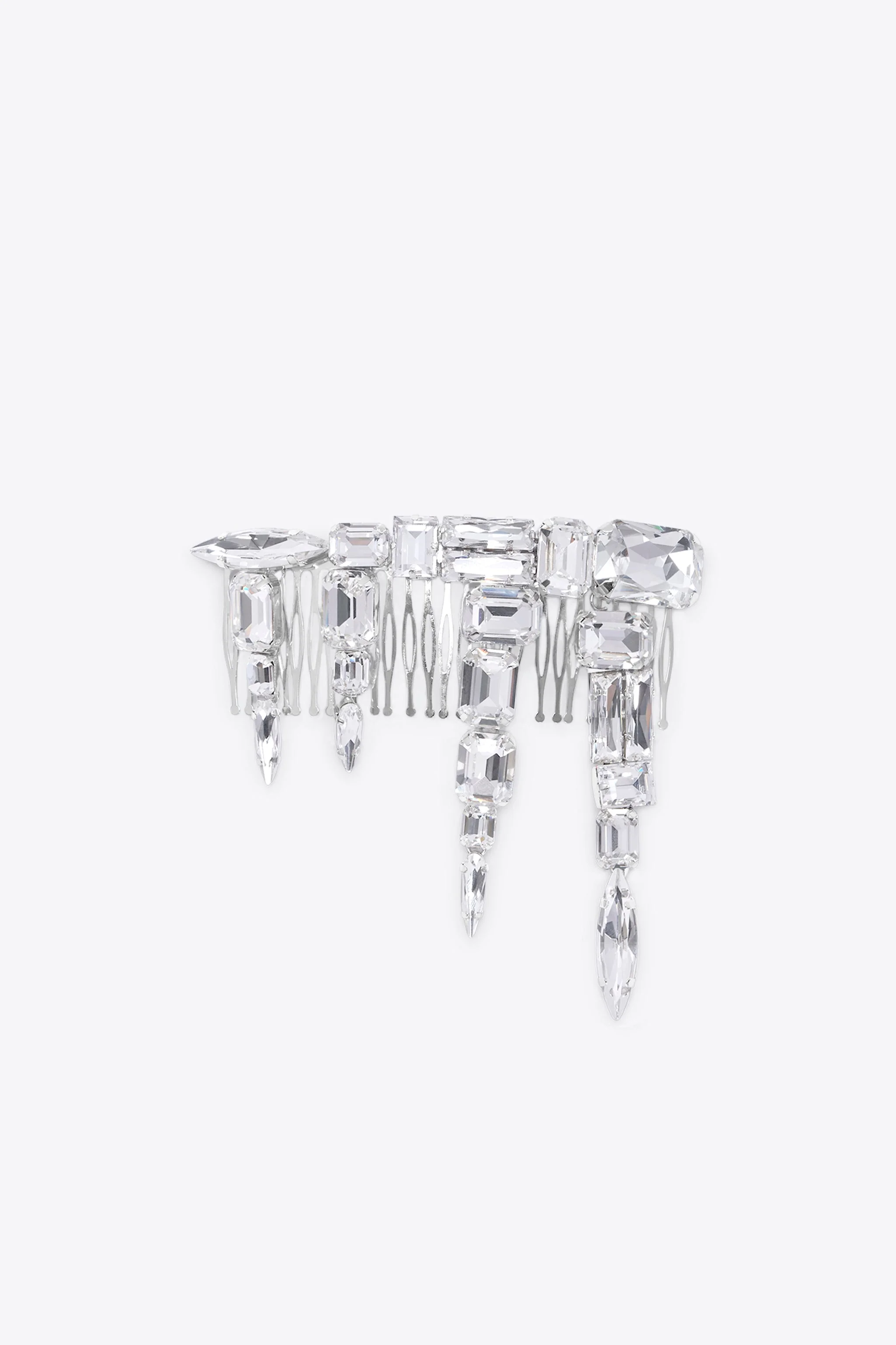 Crystal cluster hairpiece. Available in Silver. - Metal: 100% Brass, Stones: 100% Glass - To protect and assure the longevity of your jewelry and accessories, handle delicately when dressing. Do not wear while swimming, bathing, applying perfumes, lotions or hair products. To clean your pieces use a soft cloth and gently wipe the surface.