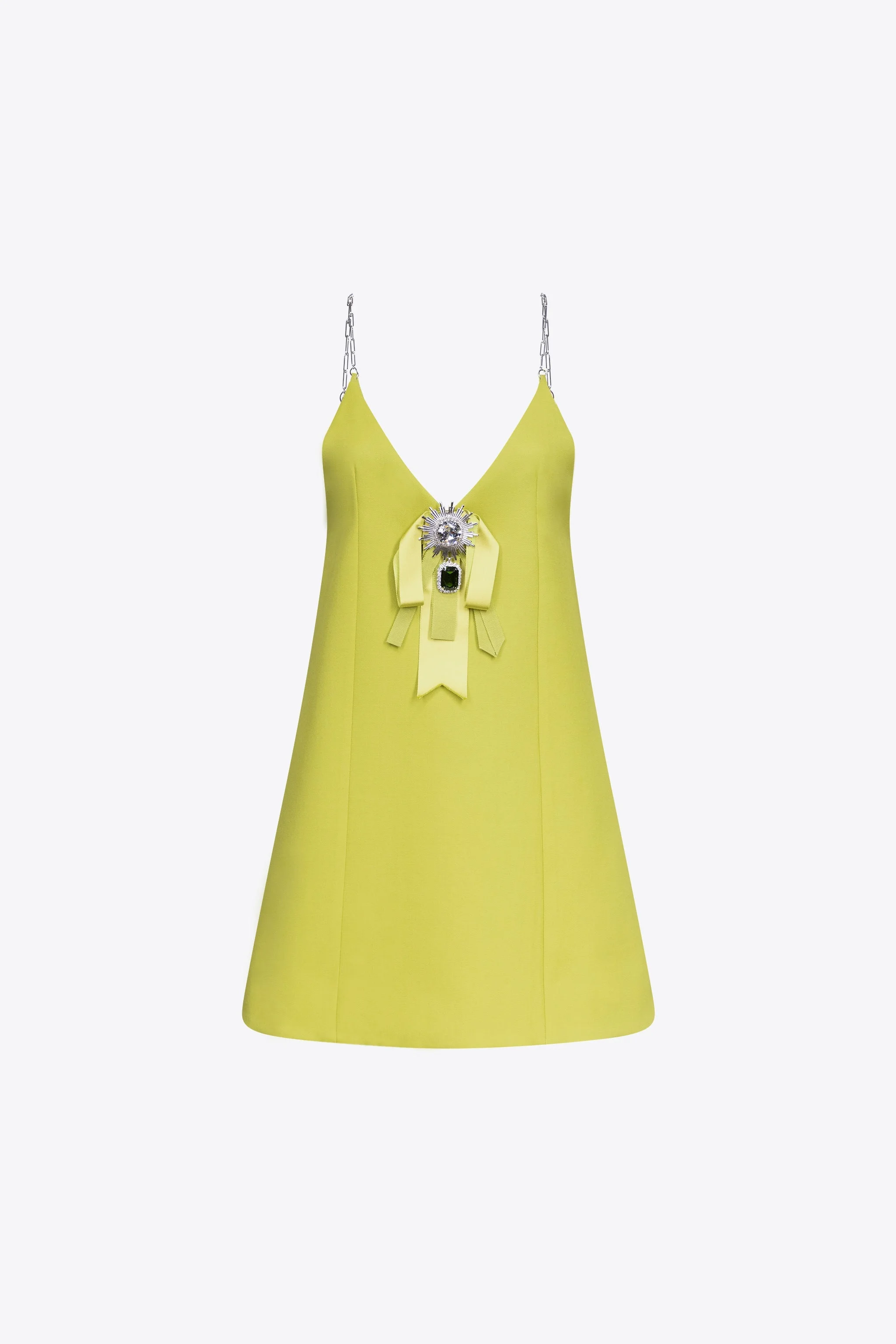 Wool suiting mini dress featuring crystal embellished bow detailing at center front and adjustable chain shoulder straps. Available in Chartreuse & Pastel Pink. - Fabric: 100% Virgin Wool, Lining: 100% Viscose - Dry Clean Only - Model is 5'11.5" and wears a size S