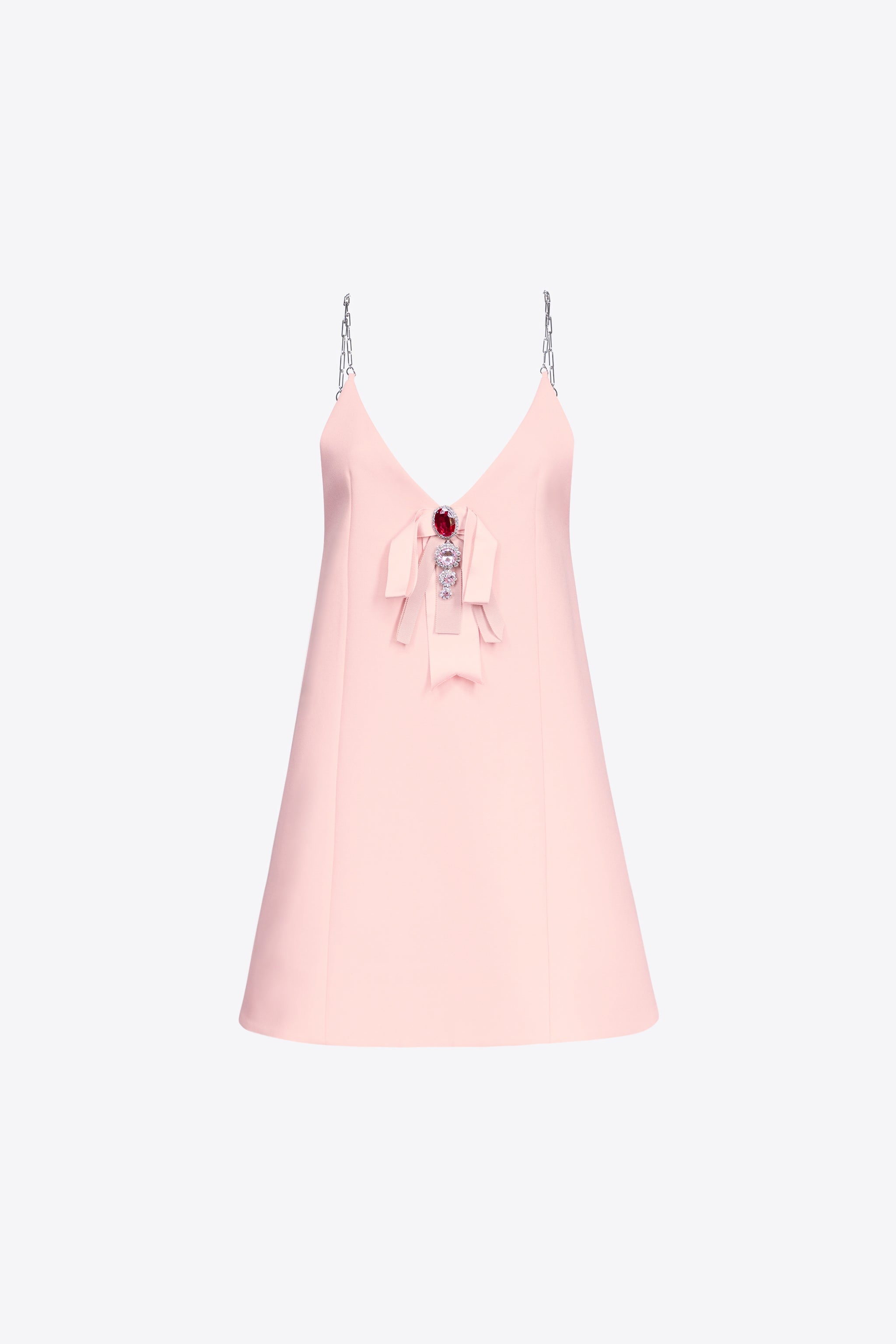 Wool suiting mini dress featuring crystal embellished bow detailing at center front and adjustable chain shoulder straps. Available in Pastel Pink 7 Chartreuse. - Fabric: 100% Virgin Wool, Lining: 100% Viscose - Dry Clean Only - Model is 5'11.5" and wears a size S
