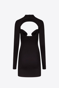 Compact ponte jersey long sleeve mini dress with crystal embellished bustier cups. Features cut out at chest and back, and hidden back zipper. Available in Black. - 65% Rayon, 30% Nylon, 5% Elastane - Dry Clean Only - Model is 5'11" and wears a size S