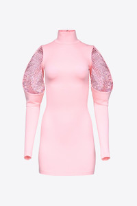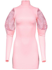 Compact ponte jersey turtle neck dress featuring cold-shoulder detail with crystal embellishment. Available in Candy Rose & Black. - 67%Rayon, 28% Nylon, 5%Spandex - Model is 5'10 and wears a size XS - Dry clean only