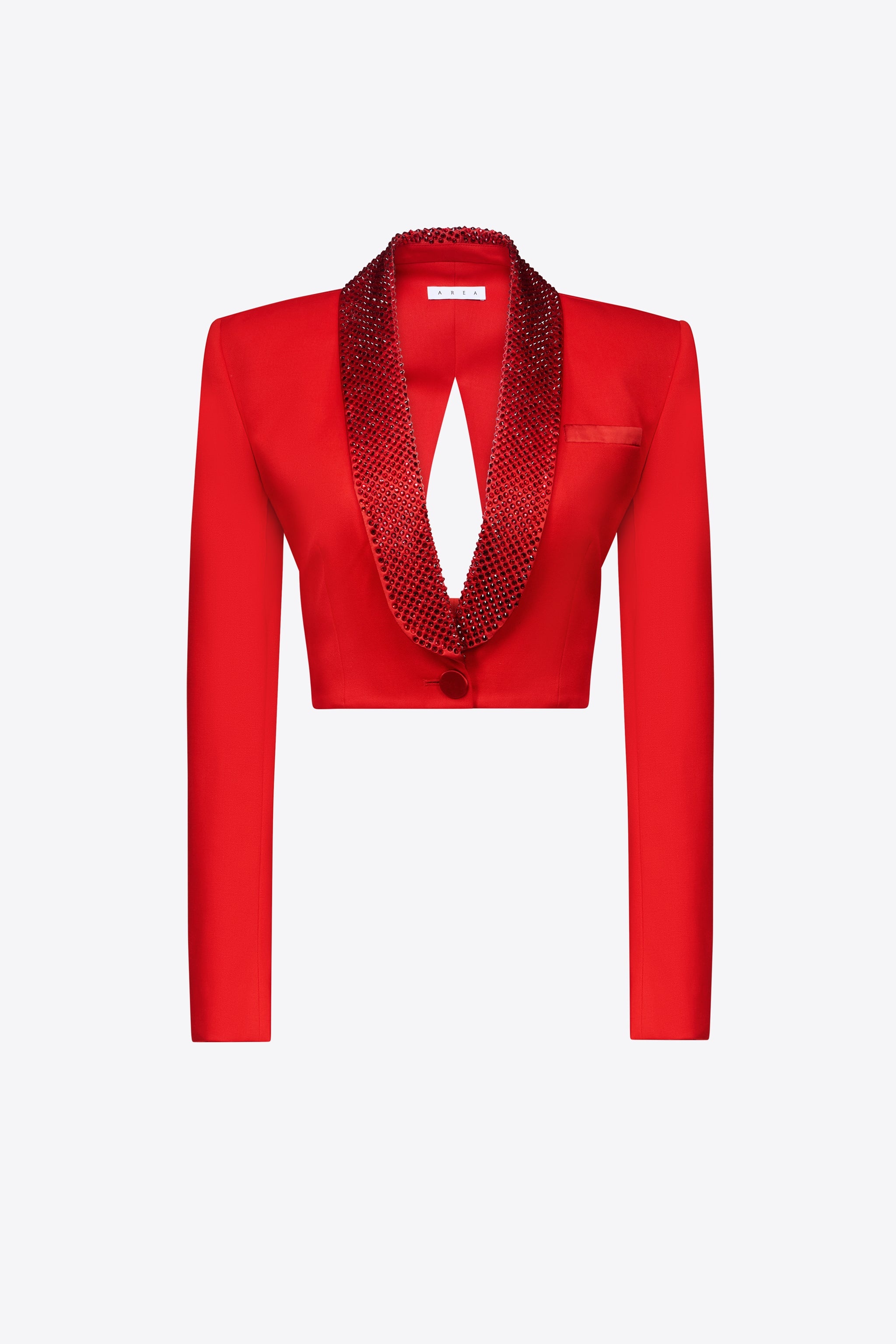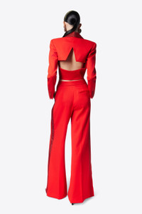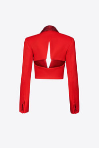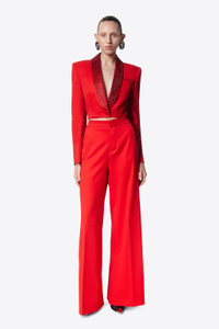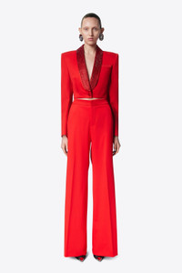 Wool suiting cropped blazer featuring crystal embellished tuxedo shawl lapel and star cutout detail at back. Available in Scarlet and Black. - Shell: 98% Wool, 2% Elastane Lining: 100% Viscose - Dry Clean Only - Model is 5'11" and wears a size US 2
