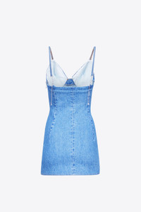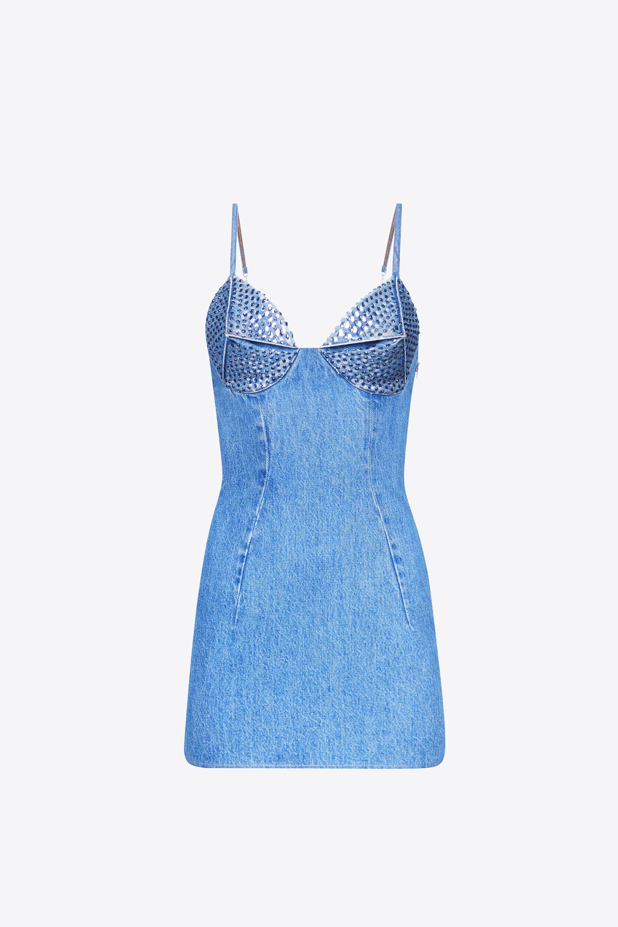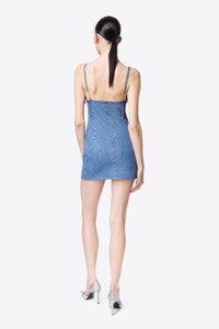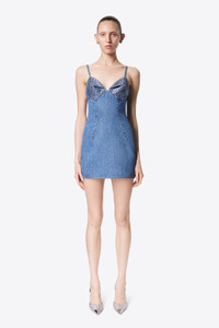 Denim mini dress featuring sculptured crystal embellished cups, adjustable straps and hidden back zipper. Available in Medium Indigo. - 100% Cotton - Dry Clean Only - Model is 5'11" and wears a size US 2