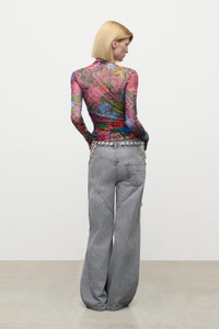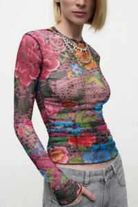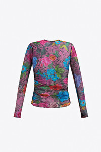 CRYSTAL EMBELLISHED PRINTED TULLE LONG SLEEVE TOP