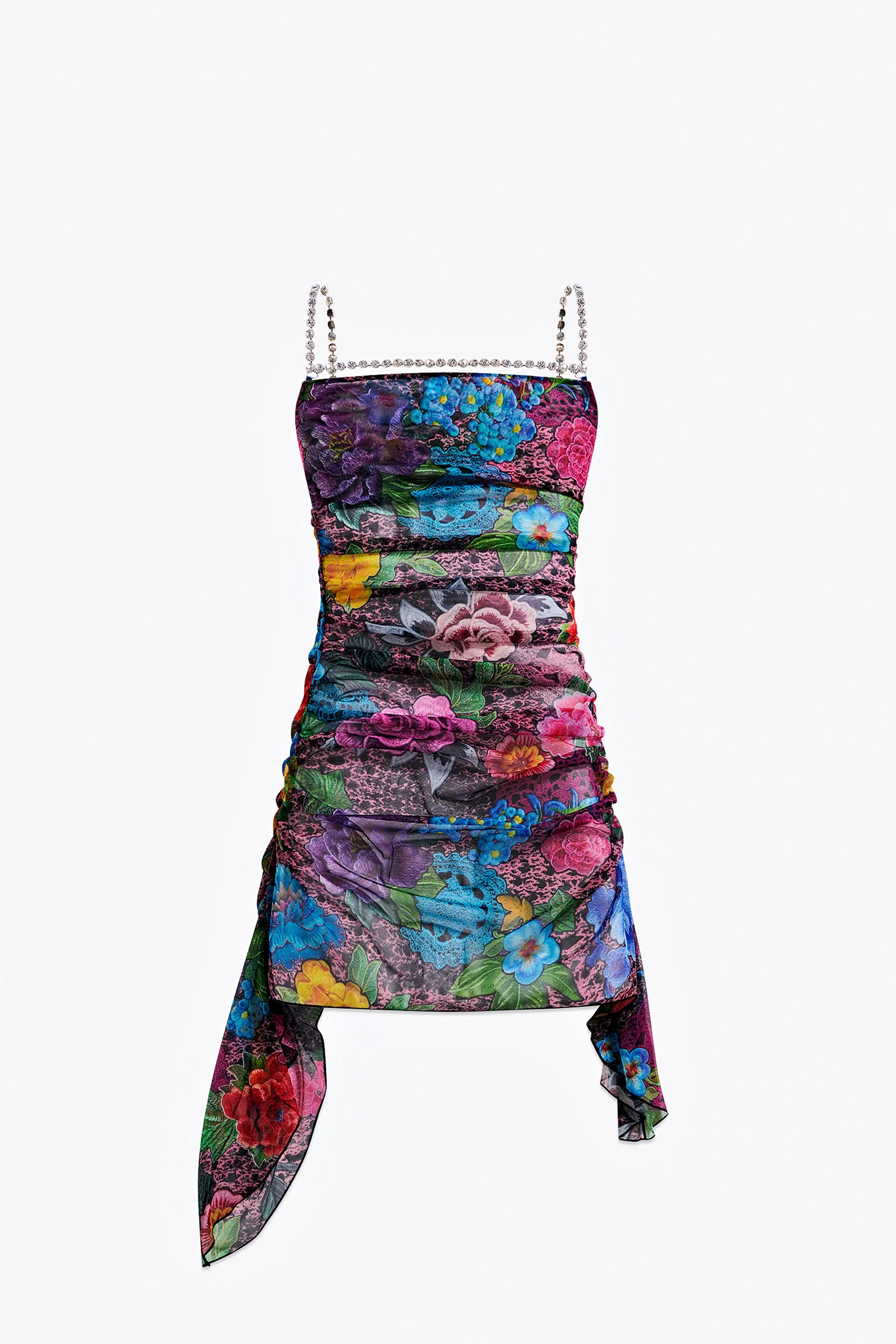 CRYSTAL EMBELLISHED PRINTED TULLE MINI DRESS