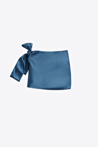 Satin mini skirt featuring crystal trim waistband and bow. Available in Steel Blue & Fuchsia. - 100% Polyester - Dry Clean Only - Model is 5'9.5" and wears a size S