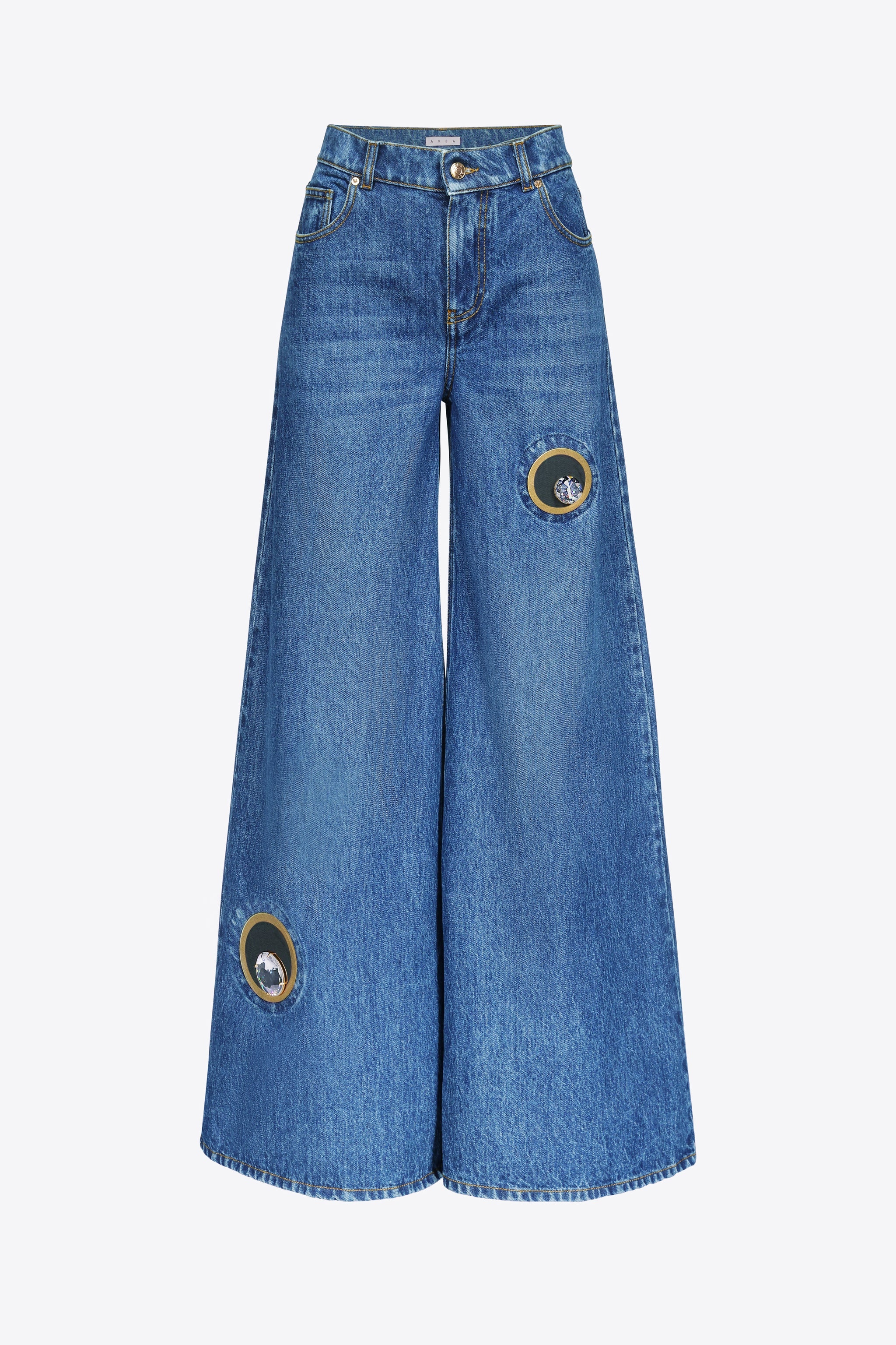 Denim wide leg jean featuring crystal eyelet cutouts and 'AREA' crystal nameplate at rear pocket. Zip / fly closure at center front. - 100% Cotton - Dry Clean Only - Model is 5'10" and wears a size 26