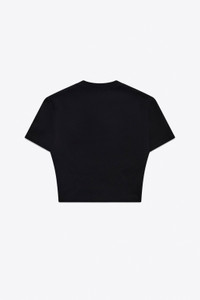 Ponte jersey cropped t-shirt featuring crystal flower cutout. Available in Black. - Made in Italy - 68% Viscose, 27% Polyamide, 5% Elastane - Dry Clean Only - Model is 5'9.5" and wears a size S