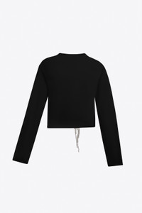 Jersey crewneck long sleeve shirt featuring draped waist and crystal flower embellishment. Available in Black & Fuchsia. - 95% Polyester, 5% Elastane - Dry Clean Only - Model is 5'9" and wears a size S