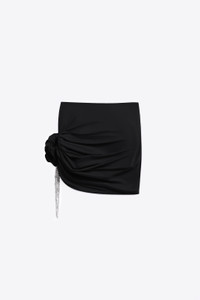 Draped mini skirt featuring crystal flower embellishment. Available in Black & Fuchsia. - 95% Polyester, 5% Elastane - Dry Clean Only - Model is 5'9" and wears a size S