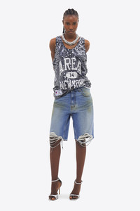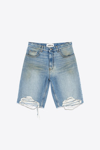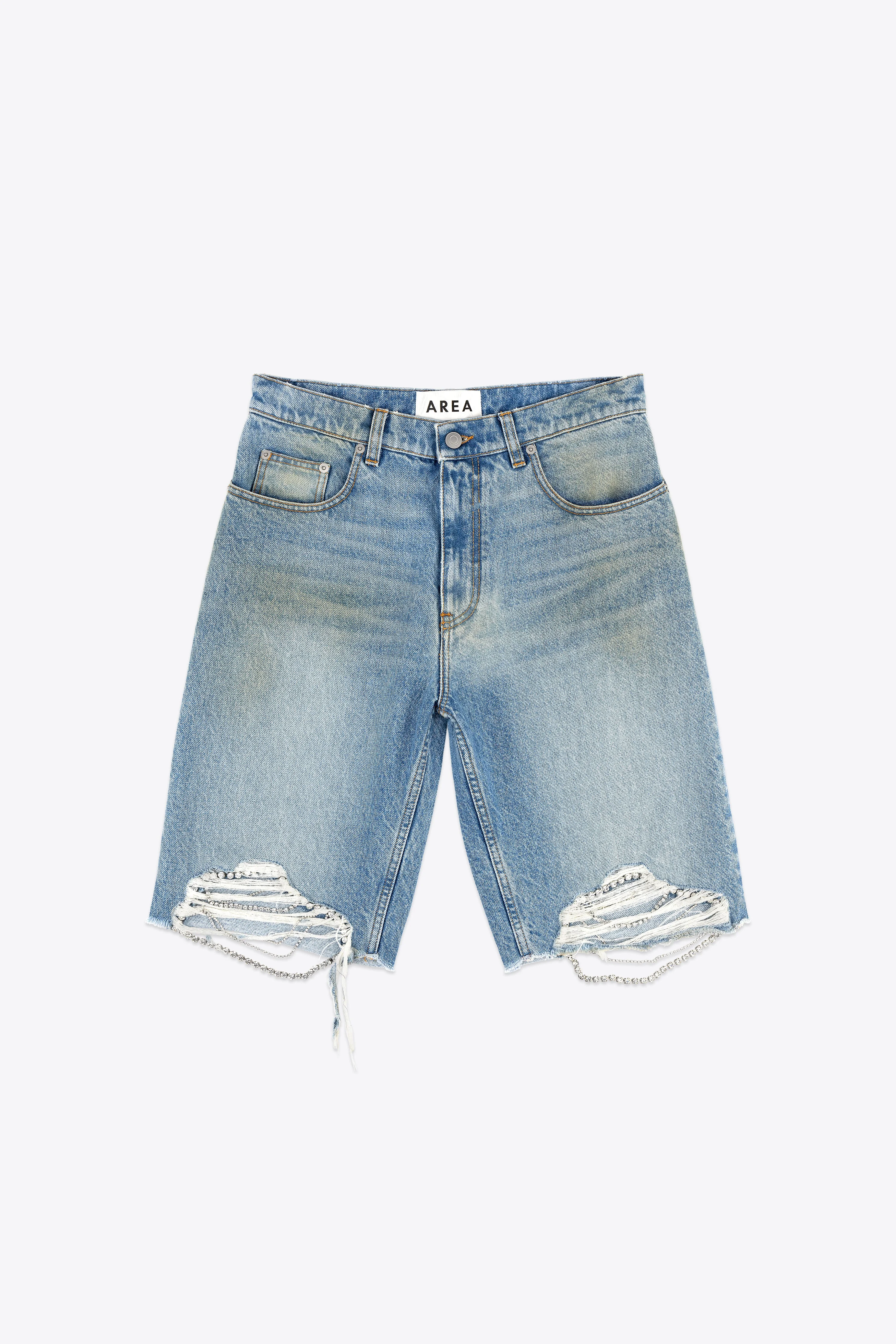 Denim shorts with distressed crystal embellishment and front button closure. - 100% Cotton - Machine wash cold, reduced cycle - Model is 5'11.5" and wears a size US 26