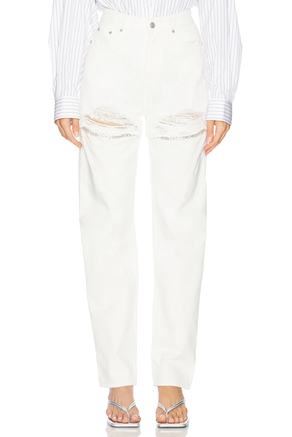 - 100% cotton - Made in Italy - Machine wash cold - Zip fly with button closure - Midweight denim fabric - Rhinestone-embellished trim at cut-outs - Intentional distressing 5-pocket styling.15" at the leg opening - Revolve Style No. ARRE-WJ9 - Manufacturer Style No. RS26AWPA0101DE02
