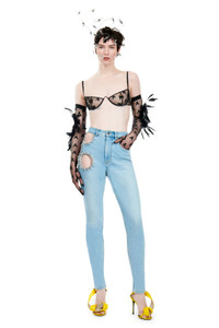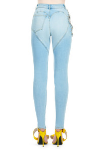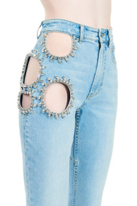 Stretch denim skinny jeans feature crystal trim grape cutout detail at hip. Available in Light Blue. - 97% Cotton, 3% Elastane - Dry Clean Only - Model is 5'10" and wears a 26