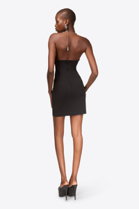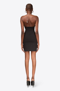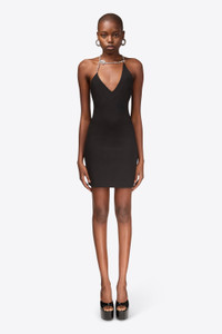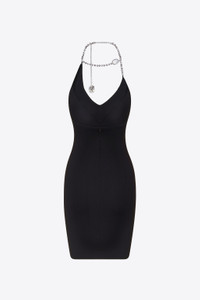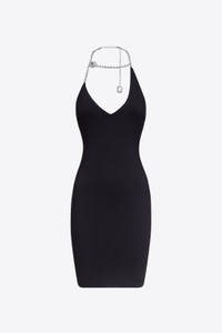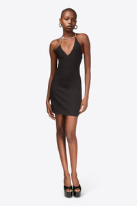 Compact ponte jersey halter mini dress featuring adjustable gemstone chain plate necklace. Available in Black. - 68% Viscose, 27% Polyamide, 5% Elastane - Dry Clean Only - Model is 5'9.5" and wears a size S