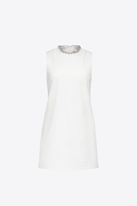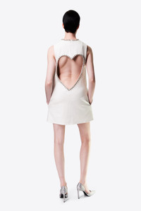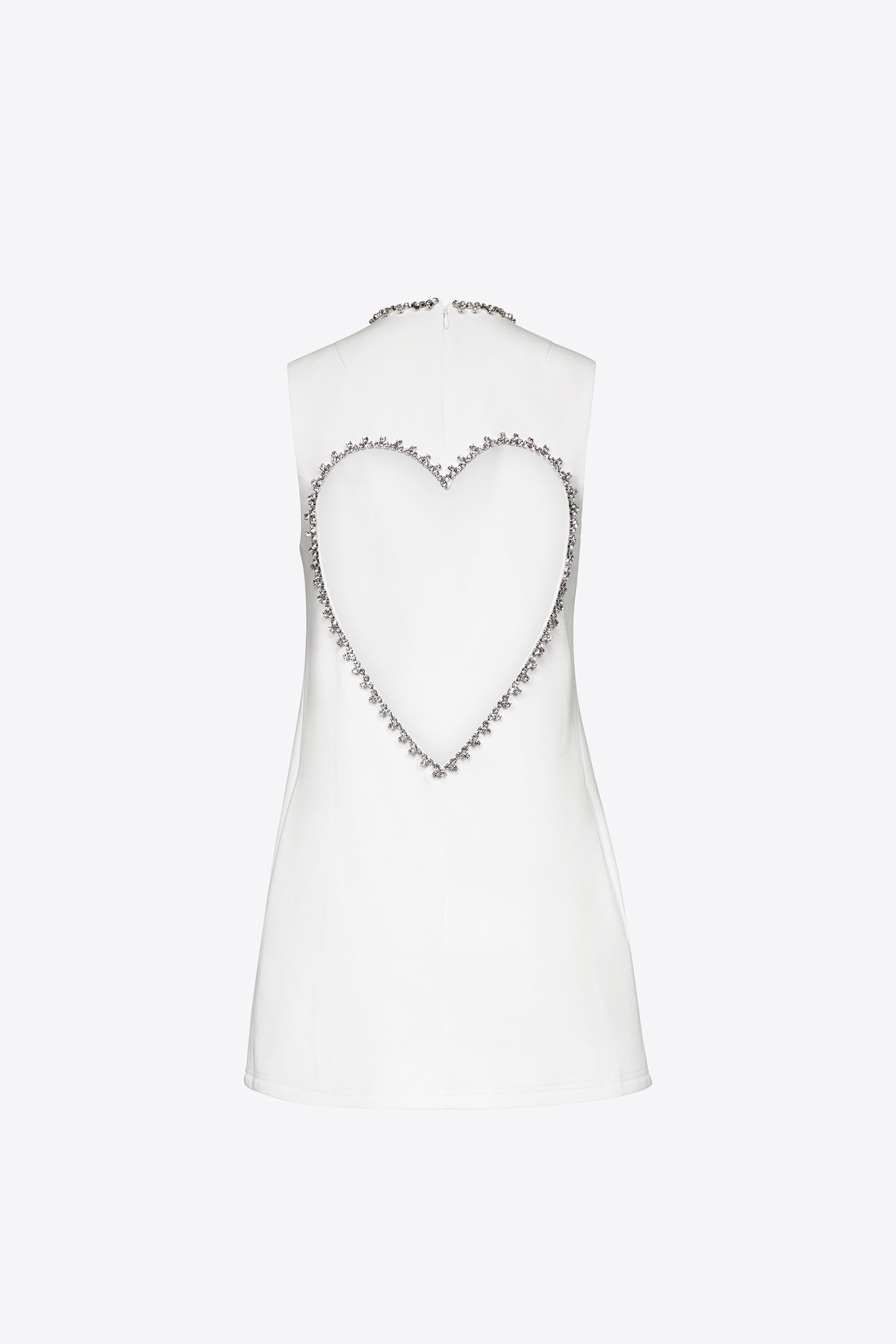 Compact ponte jersey sleeveless mini dress features crystal trim heart cutout back and side pockets. Available in White, Powder Pink and Black. - 67% Rayon, 28% Nylon, 5% Elastane - Model is 5'10 and wears a size S - Dry clean only
