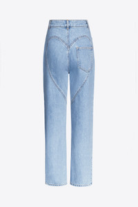 Denim jean with embellished heart cut-out, right pocket trim. Features denim zipper-fly closure at center front and heart patch at rear. Designed with straight leg and mid-rise for a relaxed fit. If in between sizes, we recommend you size down. Available in Light Blue. - Made in Italy - 100% Cotton - Dry Clean Only - Runs true to size.