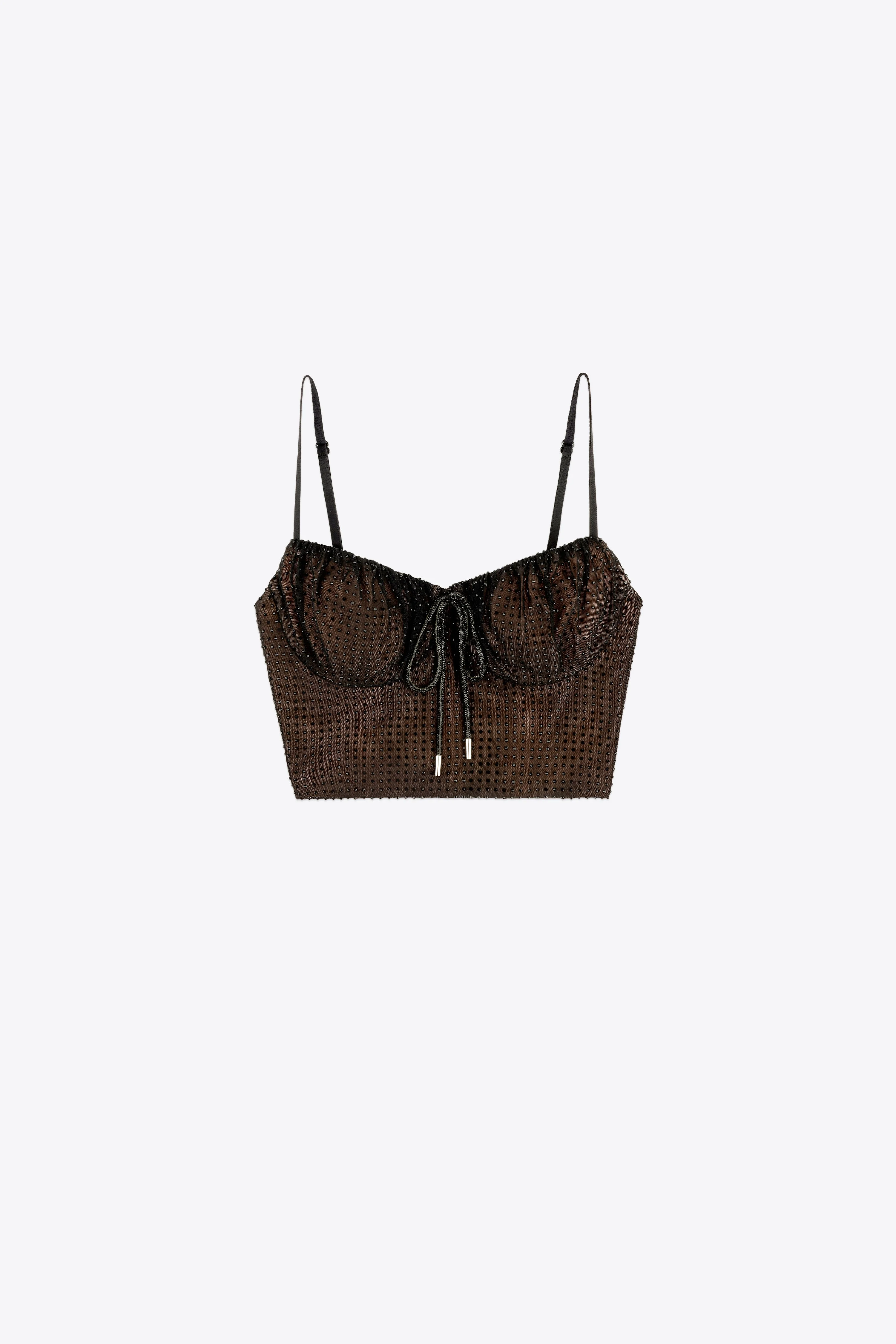 Crystal hotfix top featuring crystal rope bow at front center and adjustable shoulder straps. Available in Black & Sky Blue. - 92% Polyester, 8% Elastane - Dry Clean Only - Model is 5'11" and wears a size S