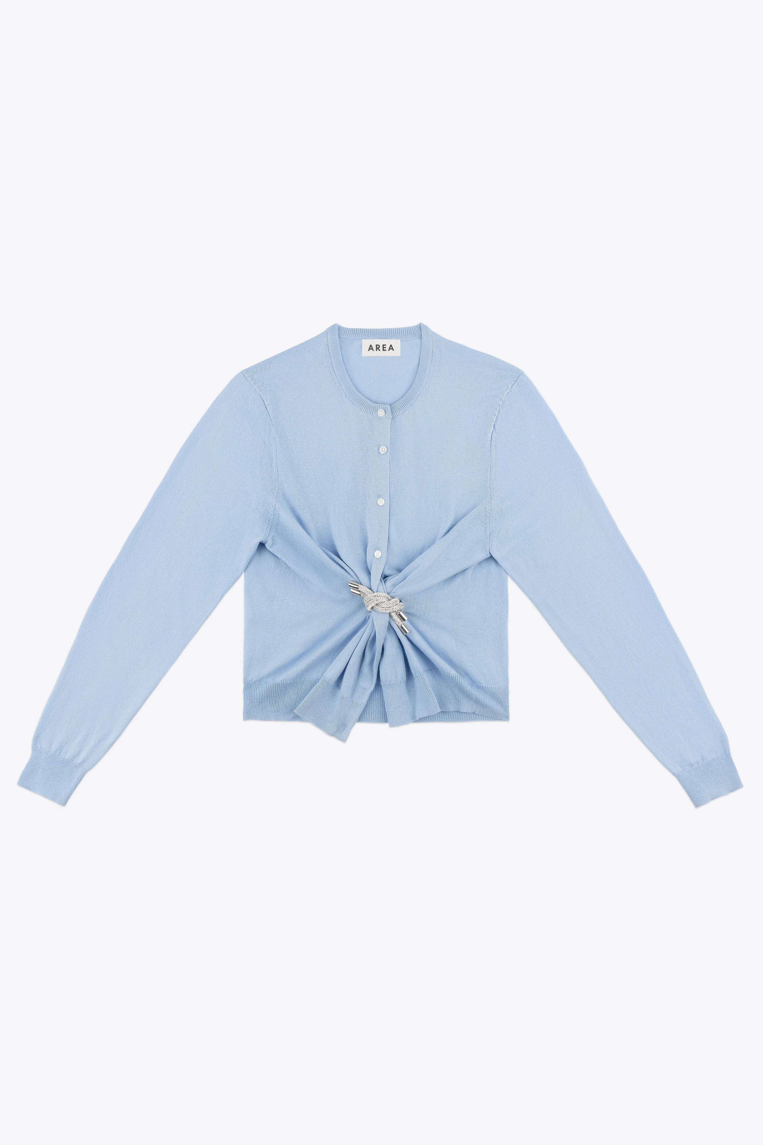 Crewneck cardigan with crystal rope knot. Available in Powder Blue & Pastel Pink. - 5% Cashmere, 95% Cotton - Dry Clean Only - Model is 5'11" and wears a size S