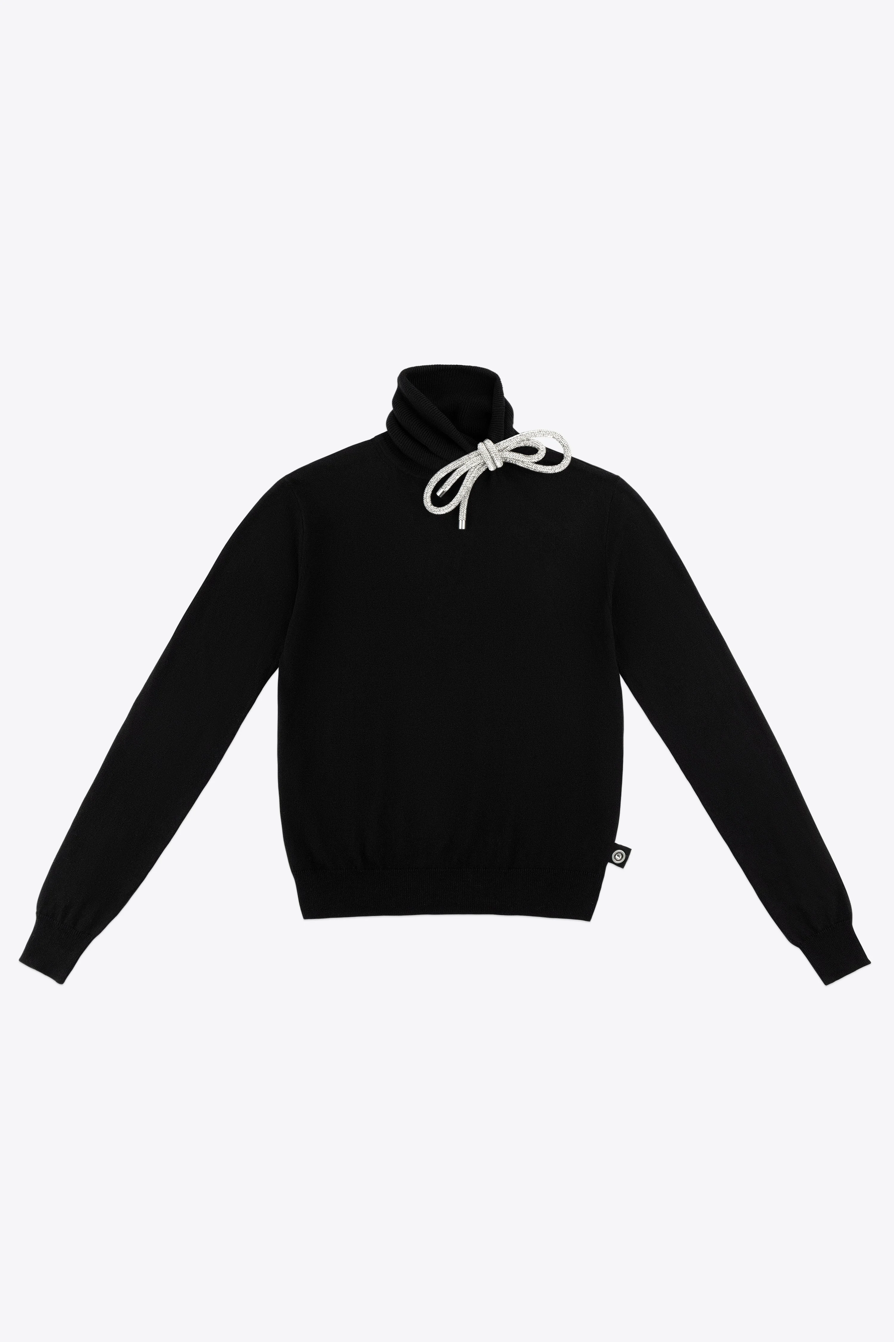 Turtleneck sweater featuring crystal rope bow embellishment at neck. Available in Black & Medium Grey. - 5% Cashmere, 95% Cotton - Dry Clean Only - Model is 5'11" and wears a size S