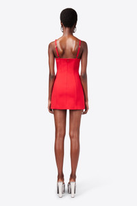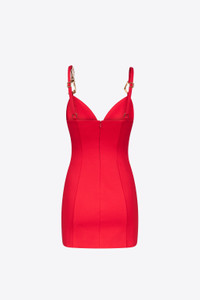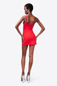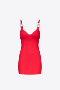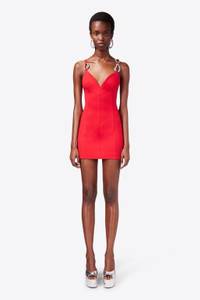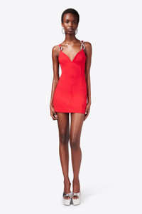 Compact ponte jersey mini dress with pave crystal link embellishment. Features adjustable shoulder straps and hidden back zipper. Available in Carmine & Black. - 67% Rayon, 28% Nylon, 5% Elastane - Dry Clean Only - Model is 5'10" and wears a size S
