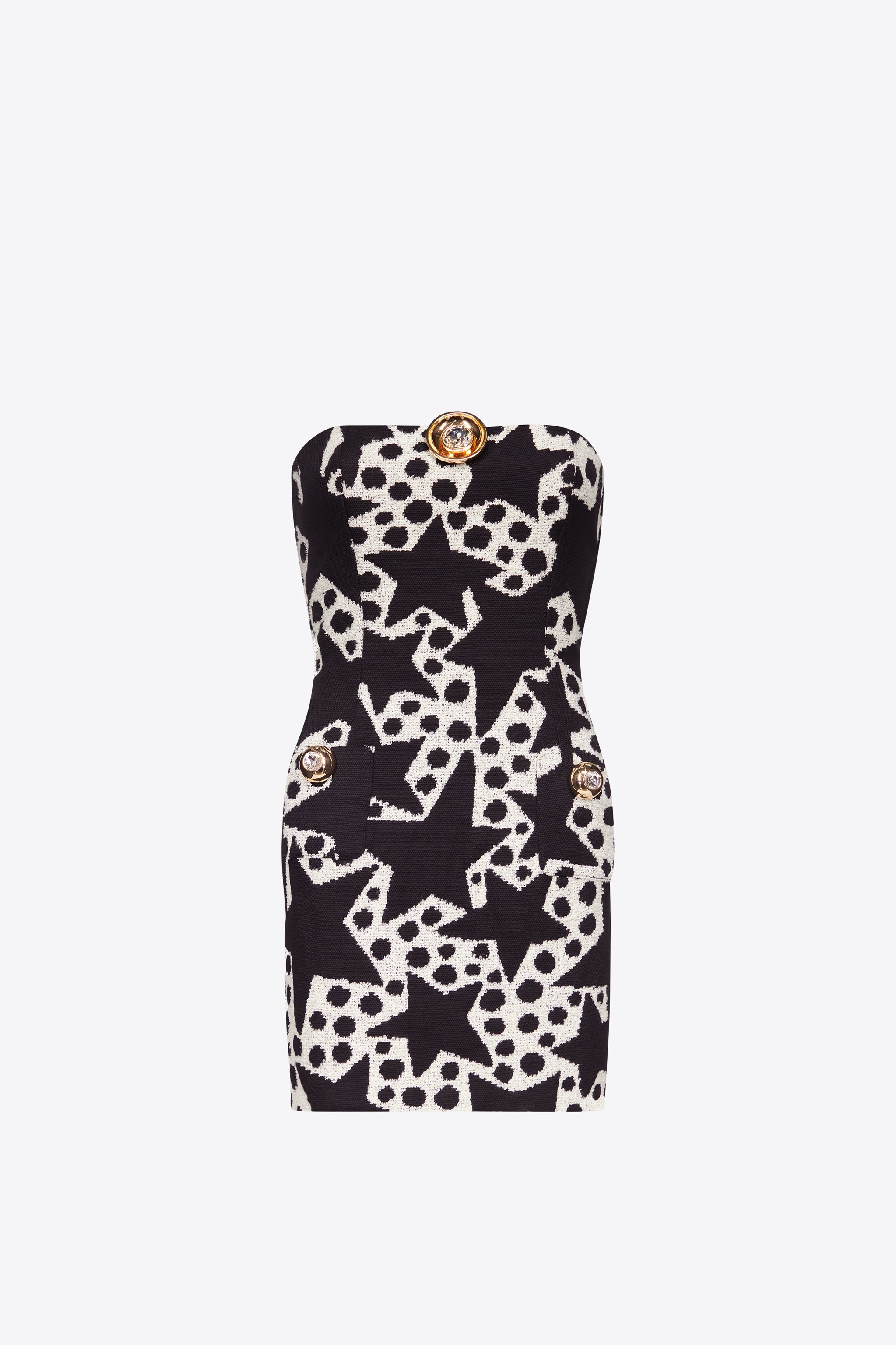 Jacquard dotted star print strapless mini dress featuring medallion embellishment and front patch pockets. Available in Black Multi. - Shell: 63% Cotton, 30% Virgin Wool, 7% Polyamide Lining: 100% Viscose - Dry Clean Only - Model is 5'10" and wears a size US 2