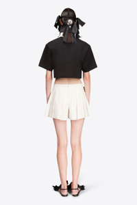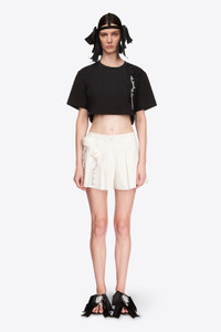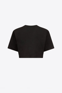 Cropped t-shirt featuring crystal trim and rosette embellishment. Available in Black & White. - 95% Cotton, 5% Elastane - Dry Clean Only - Model is 5'11.5" and wears a size S