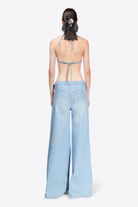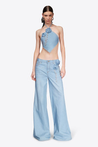 Handkerchief top embellished with crystal trim and rosette. Features ties at neck and back. Available in Super Light Blue. - 100% Cotton - Dry Clean Only - Model is 5'11.5" and wears a size S